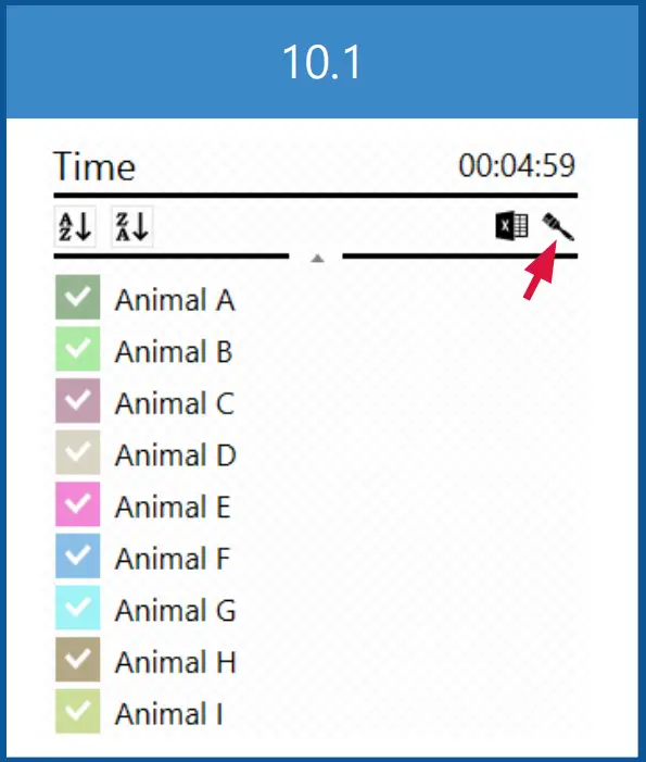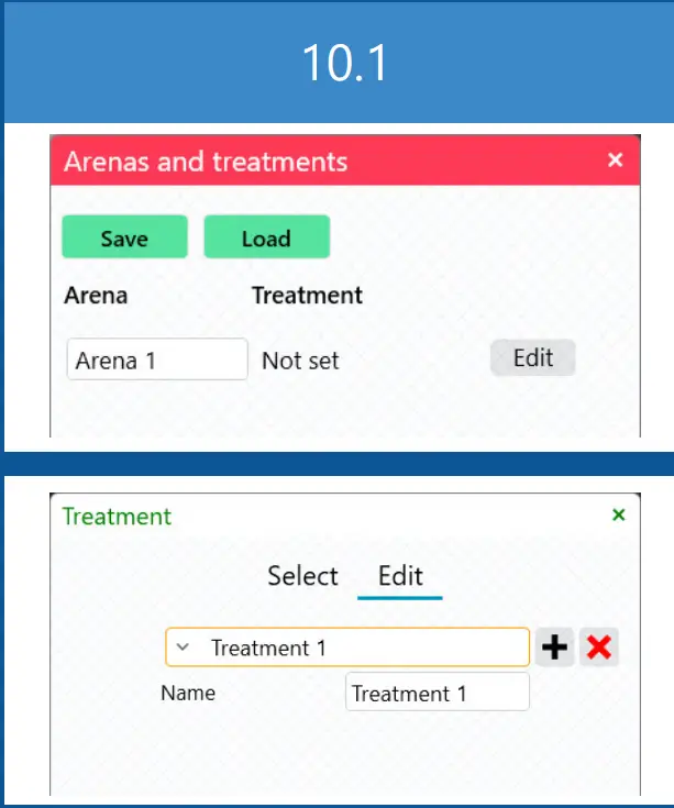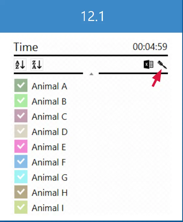 C. Arenas and treatments: Edit the names of arenas and treatments, and apply a treatment to a given arena (10.1). The arena names and applied treatments can be saved and applied to a video with an identical setup. - D. Export to Excel: Choose the parameters that will be included in the Excel file for the entire video (or interval, if selected on the timeline). Selecting markers on the fish will include tracking data for the selected positions in the Excel file. Tracking data (the parameters you select in Export parameters) for arenas, zones and treatments can be exported as well.