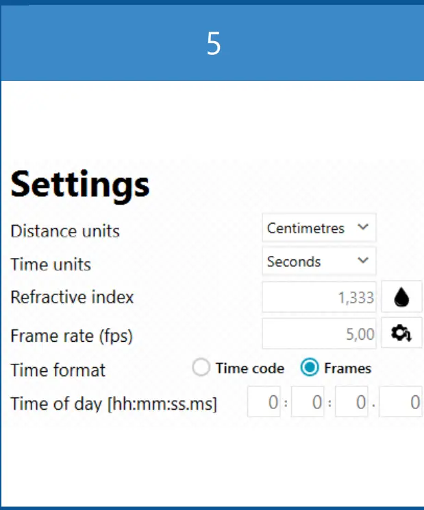 In the Calibration tab, choose the desired Distance and Time units (5). Specify the Refractive index of the medium that the object is in (typically water or air). In the Parameters section, fill out the parameter fields (L, W, D… etc.). Click on