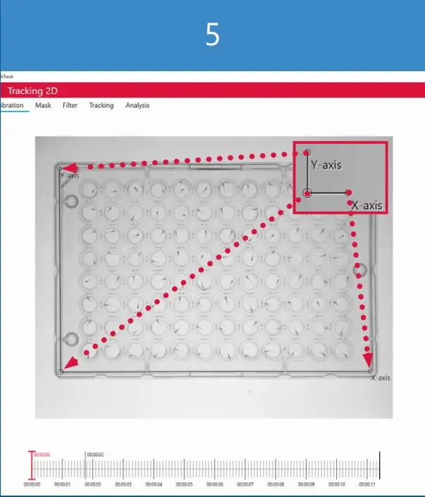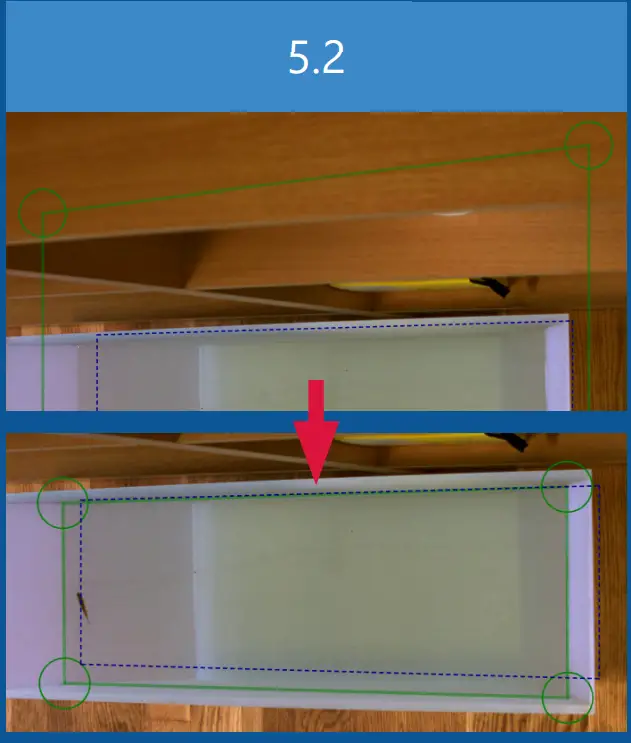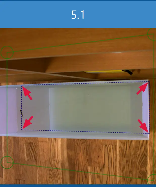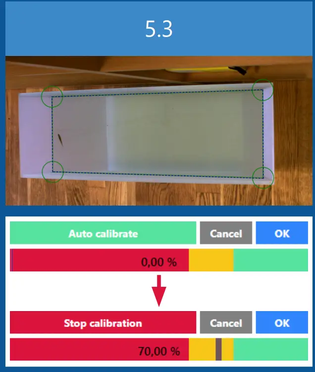 ), so that the anchor points mark the corners of the surface (5.2). If the tracked object is not in water, the green square can define the bottom of the chamber - Click Auto calibrate. The blue square should now start to approximate the shape of the green square (5.3). As the auto calibration process is an approximation, the progression status will move towards 100 % completion (5.3). It is acceptable to stop the auto calibration process, once the status is in the yellow or green area. If the progression status does not enter the yellow or green area, either change the parameters or verify that the blue square is actually on the surface. Click OK to save the calibration. Click Next to continue.