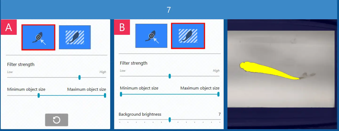 - In the Filter tab, you can create a filter that will threshold images into objects (yellow pixels), that you want to track, and irrelevant objects or background. First select filter mode A (color/ contrast) or B (background subtraction):