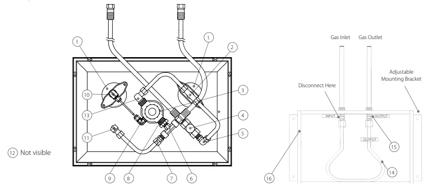 Mount the back-box into the wall and adjust the adjustable side mounting brackets so that the top of the box will be flush with the finished drywall. Connect the inlet pipe to the gas pipeline and the outlet to additional outlets (optional). The pipeline can now be pressure tested to the required testing pressure. The outlet high pressure hose is shipped with one end connected to the outlet and the other end connected to the inlet on the nitrogen back box. This will enable the installer to pressure test the complete pipeline, including remote outlets, without having to attach the front assembly