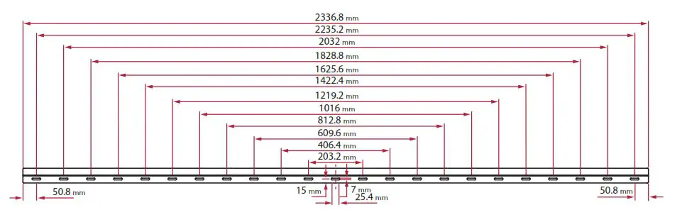 - Install the Lower Wall Mount Brackets in the same manner as the Upper Wall Mount Brackets. The distance between the Upper and Lower Wall Mount Brackets is 93.01″ (2362.5 mm).