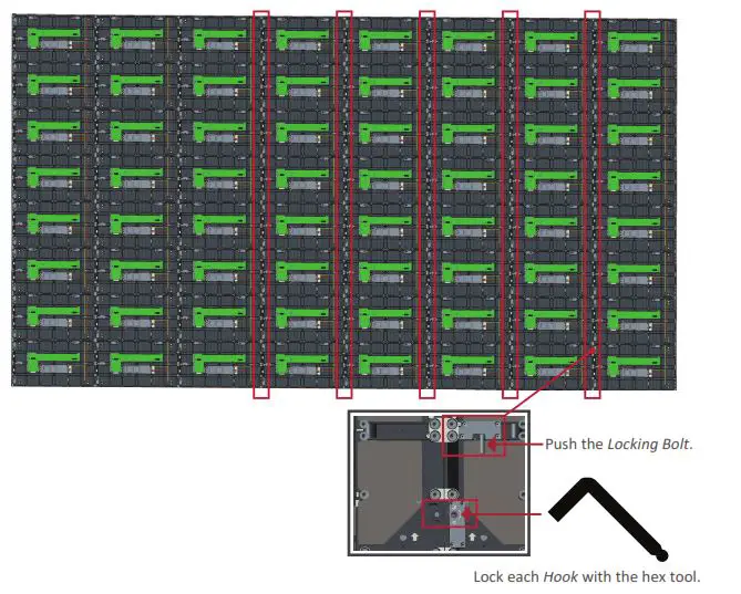 - Push each Locking Bolt and lock each Hook with the hex tool to securely connect each cabinet together. It may be necessary to align the hole with an Allen wrench in order to engage the Locking Bolt.