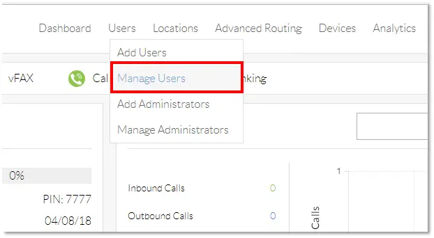 - From the Nextiva Voice Admin Dashboard, hover your cursor over Users and select Manage Users.
