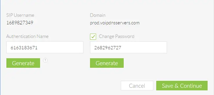 - Click the green Generate button under the Change Password checkbox. Copy the SIP Username, Domain, Authentication Name, and Password onto a notepad, or document them in some way, as they will be important in setting up Bria.
