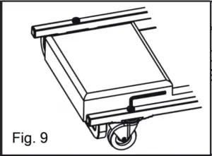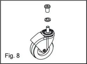 - Unscrew the top part of the castor wheels (Fig. 8) and align them with the holes in the metal frame of the creeper. Fix each castor to the frame.