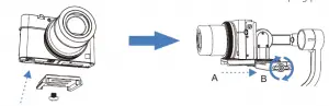 - Insert the camera with quick release plate(A) into the slot of clamping plate(B) and tighten the thumb screw