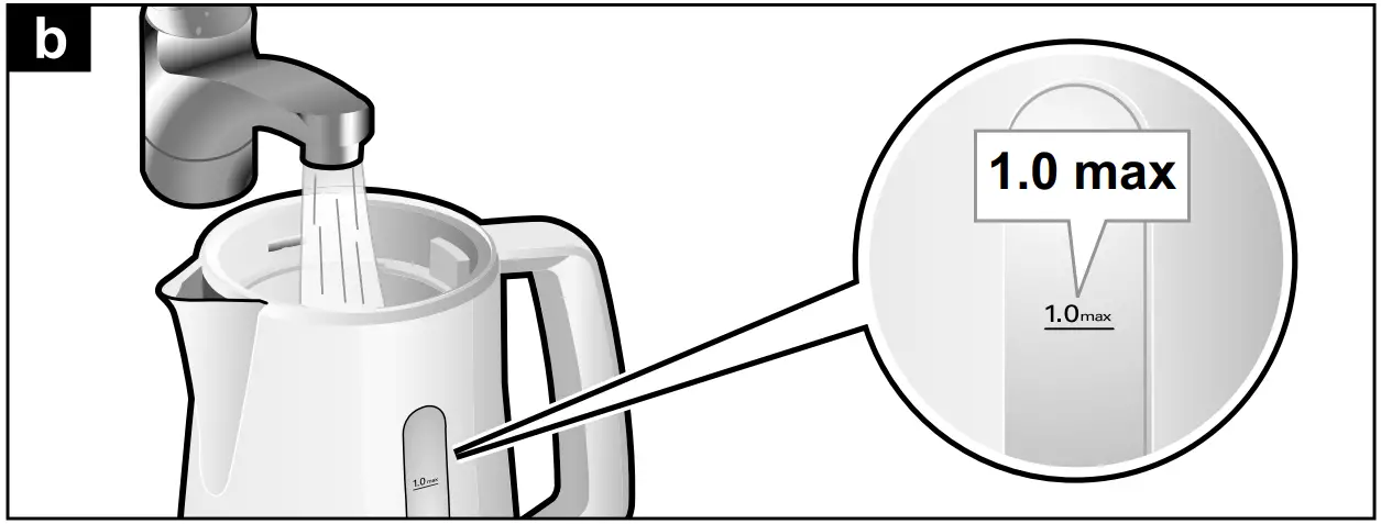 - Only fill the kettle with water. Milk and instant beverages will burn and damage the appliance. Never operate the kettle without water and do not overfill it; observe the min and max markings. If the kettle is too full, the water will boil over!