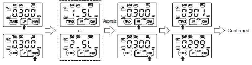 - This is mode is used for setting the threshold range for the distance from the reference value of the sensing object, by performing 1-point teaching. This mode is used for sensing within the threshold range.