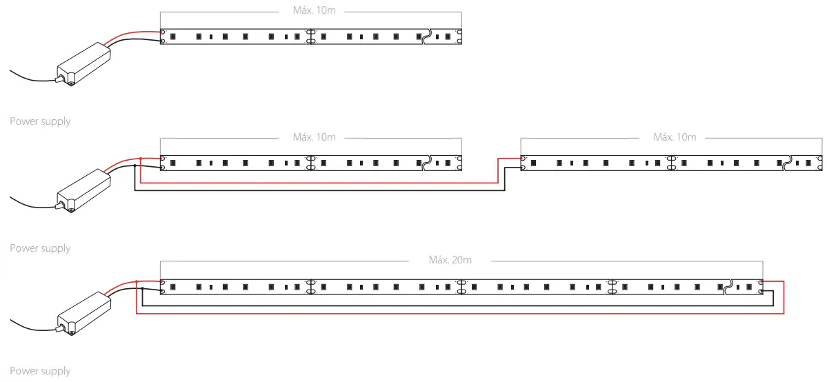 Respect the maximum lengths to avoid drops voltage and variations in light intensity.