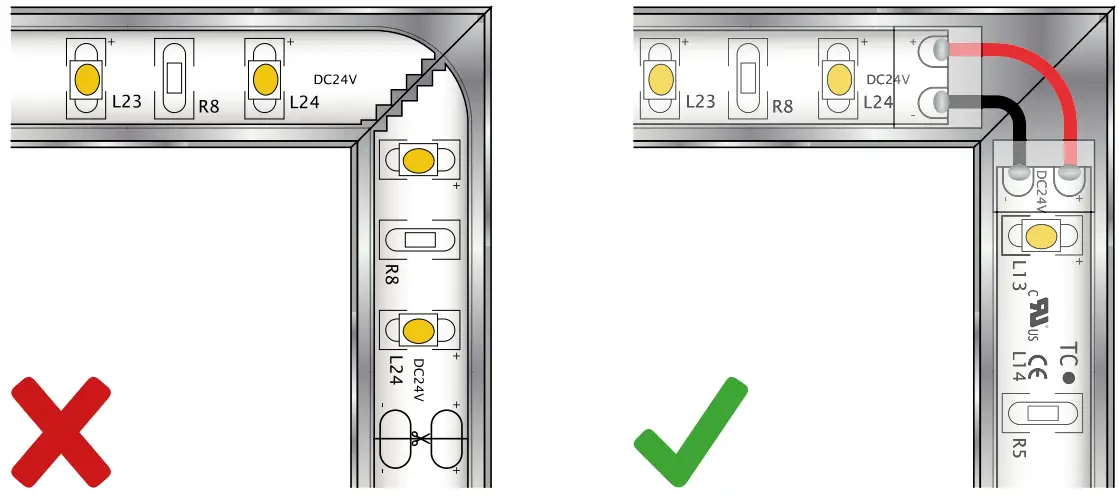 Do not bend de LED strip to adapt them to sharp radius or angle, cut for the cut mark and weld a section of cable to make the turn
