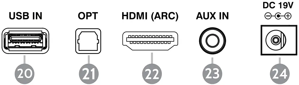 - Connect a compatible Optical device using an optical cable to the Optical IN port (21).