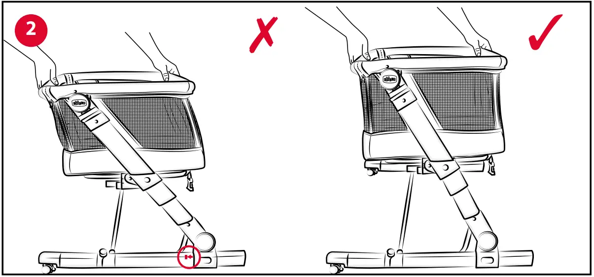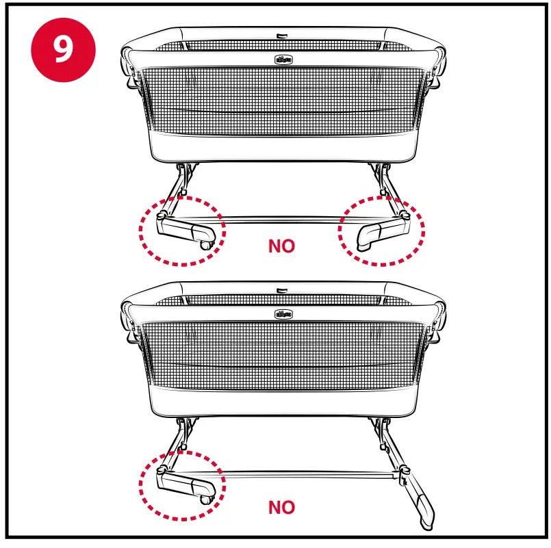 WARNING: Do not use the crib with the front articulated feet partially or completely turned or released (fig. 9). The position of correct use is illustrated in figure 10. In the case of accidental knocking against the articulated feet, put them back in the correct position by lifting the crib slightly.