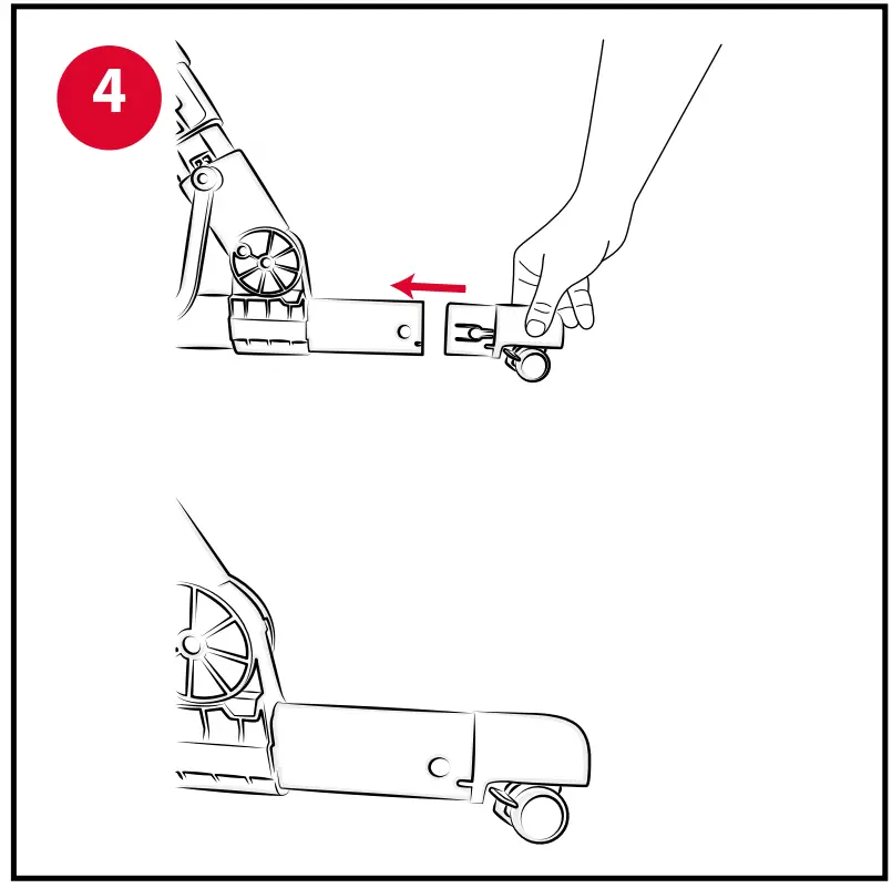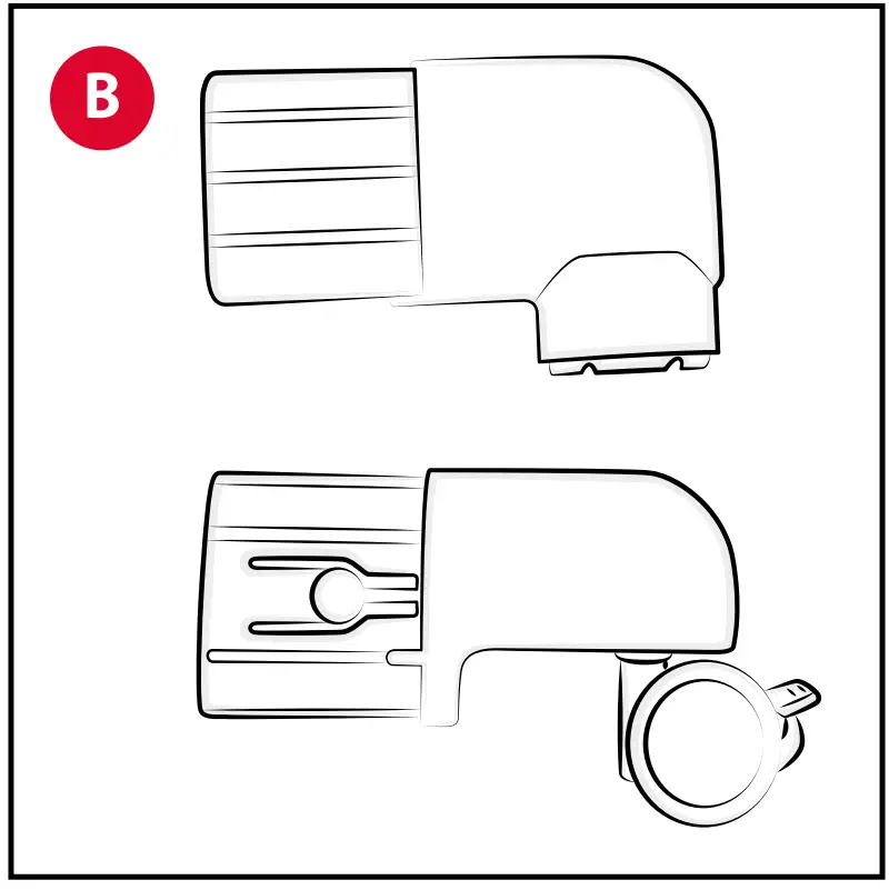 - Assemble the rear feet “B” on the back of the crib by inserting them in the tubes until a click is heard (Fig. 3-4). Be sure that the type of foot assembled matches the type used on the front of the crib (with or without wheels).