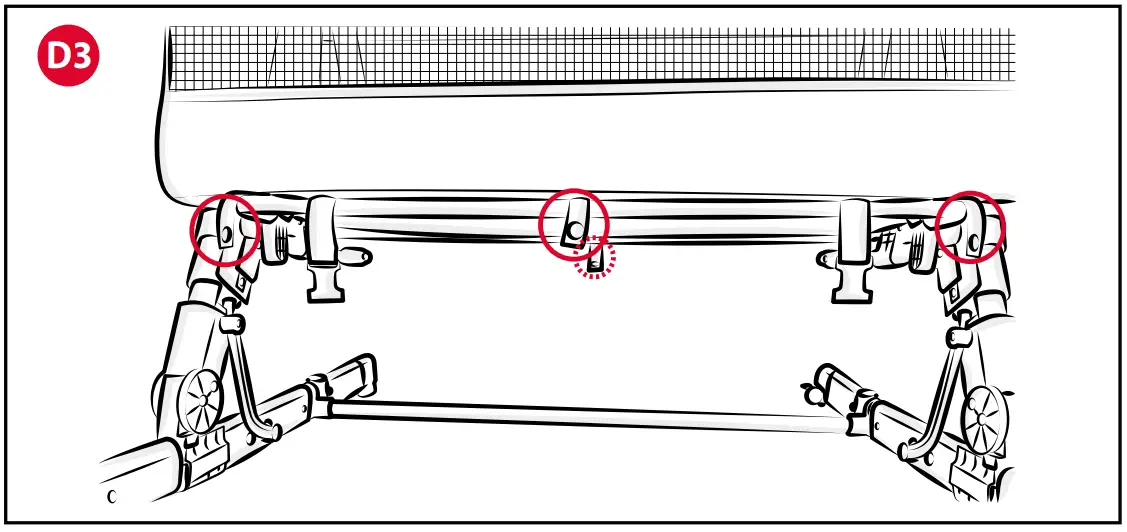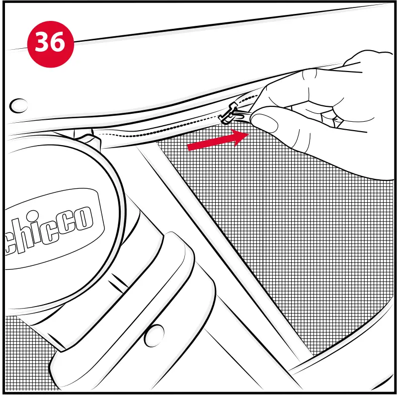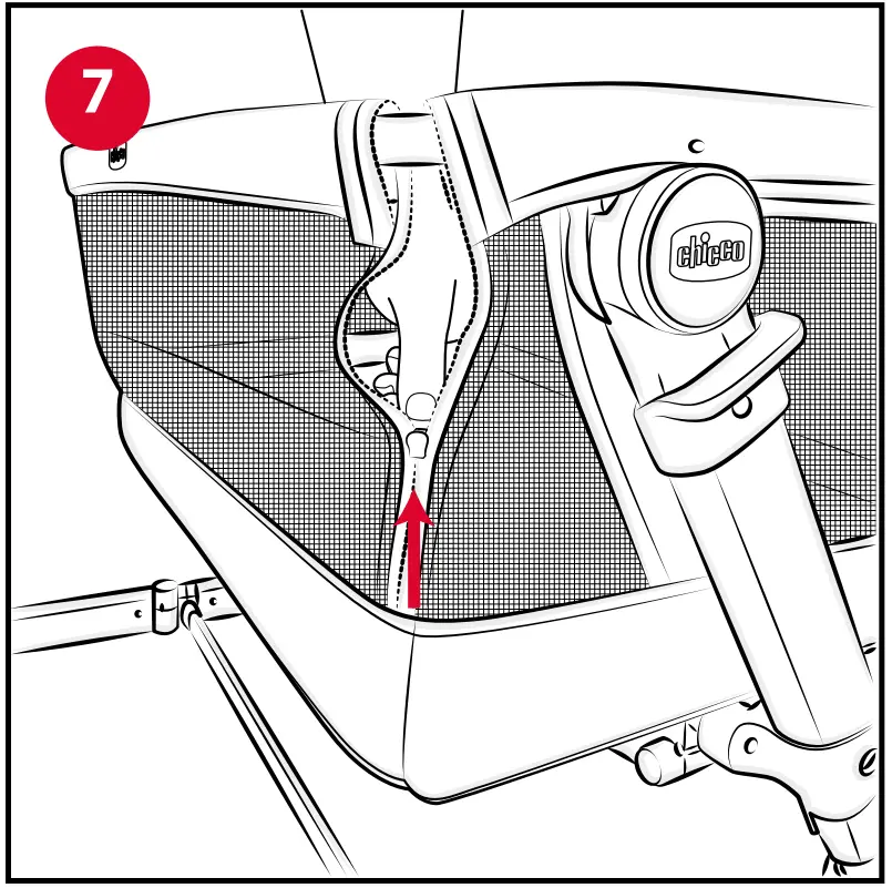 The product can be closed for storage or transportation. To close it: - If open, close the front barrier by attaching the detachable tube to the appropriate position on the frame and close the zip fasteners “D1”.