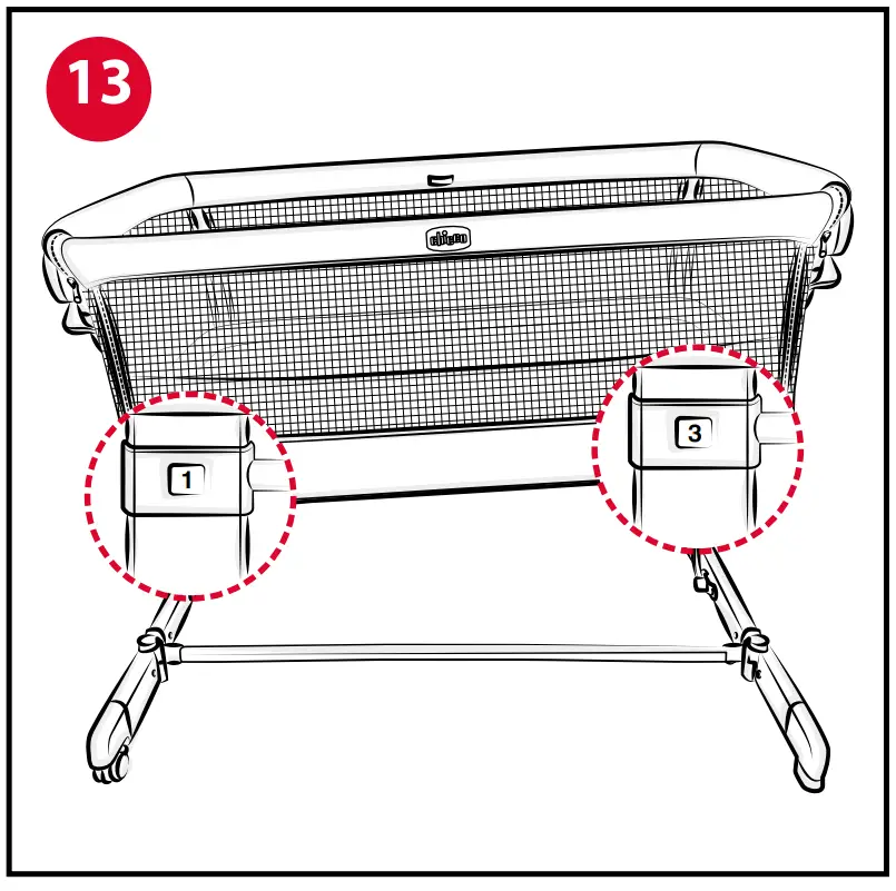 WARNING: The crib can be inclined by a maximum of 2 positions between one leg support and the other (e.g., right leg support in position 3 and left leg support in position 1) (Fig. 13).