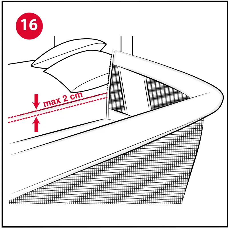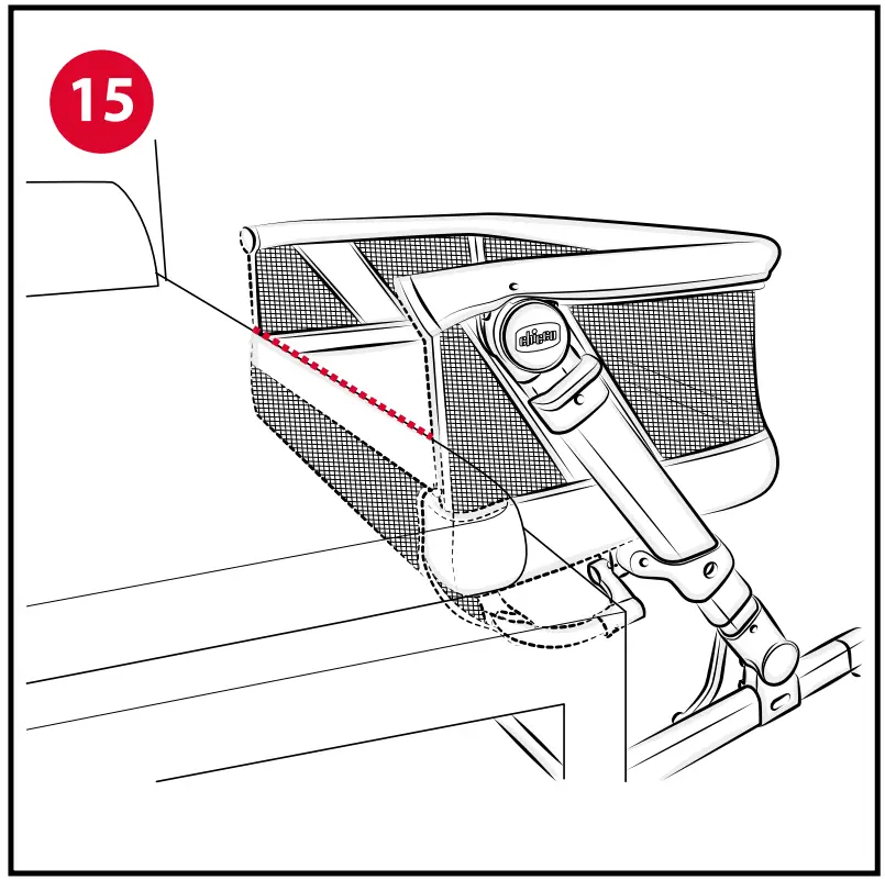 In particular, the lowered side of the crib must always be positioned against the mattress of the parents’ bed and the top 15 of the parents’mattress must be aligned with (or at most higher than) the height of the containment barrier on the open side of the crib (fig.15-16). Moreover, the crib must be firmly fastened to the structure of the parents’ bed or to the mattress support (mesh or slat sprung base).