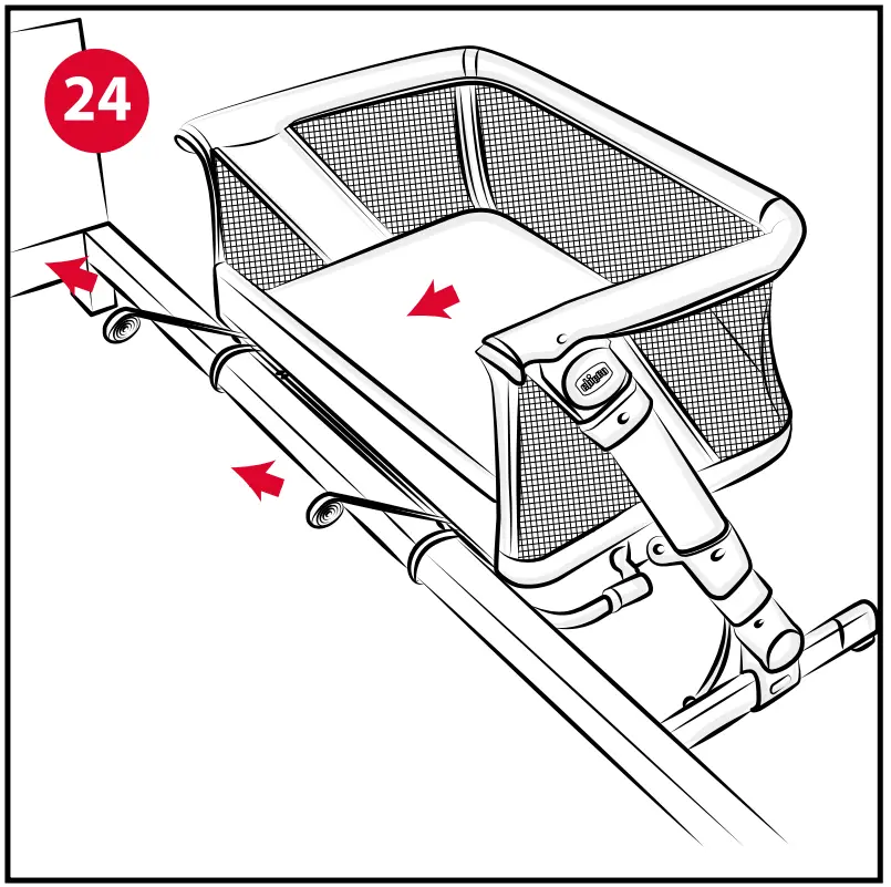 - At this point put the crib up against the parents’ bed and tighten the loop by pulling firmly on the straps “F” (Fig. 24). Carry out this step first on one side and then on the other, adjusting the straps until the crib is in firm contact with the parents’ mattress.