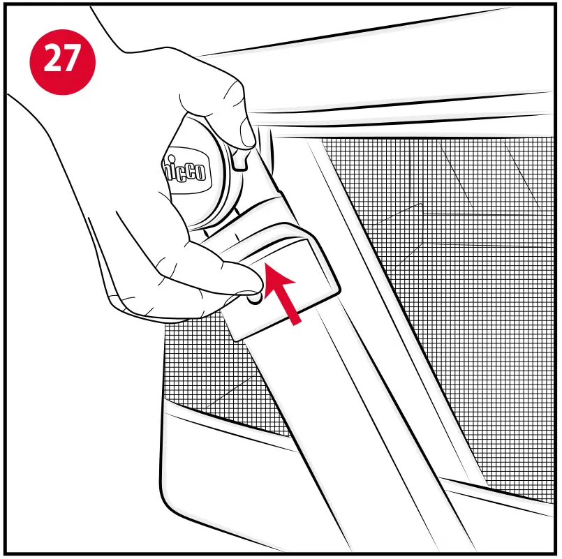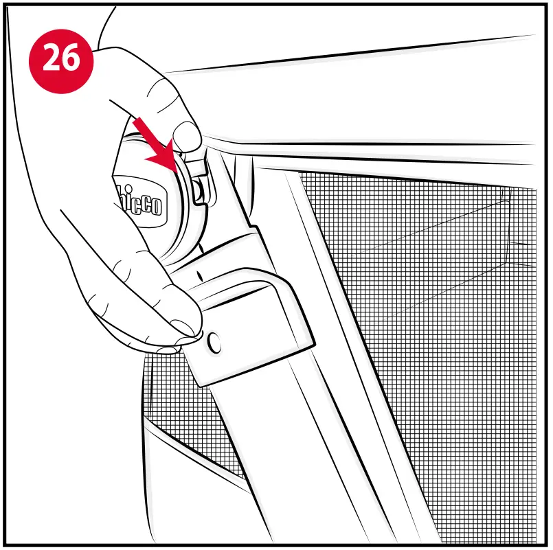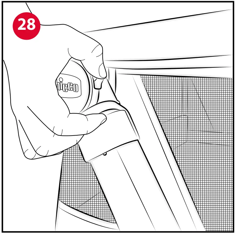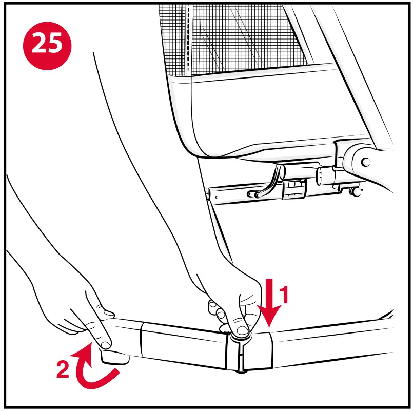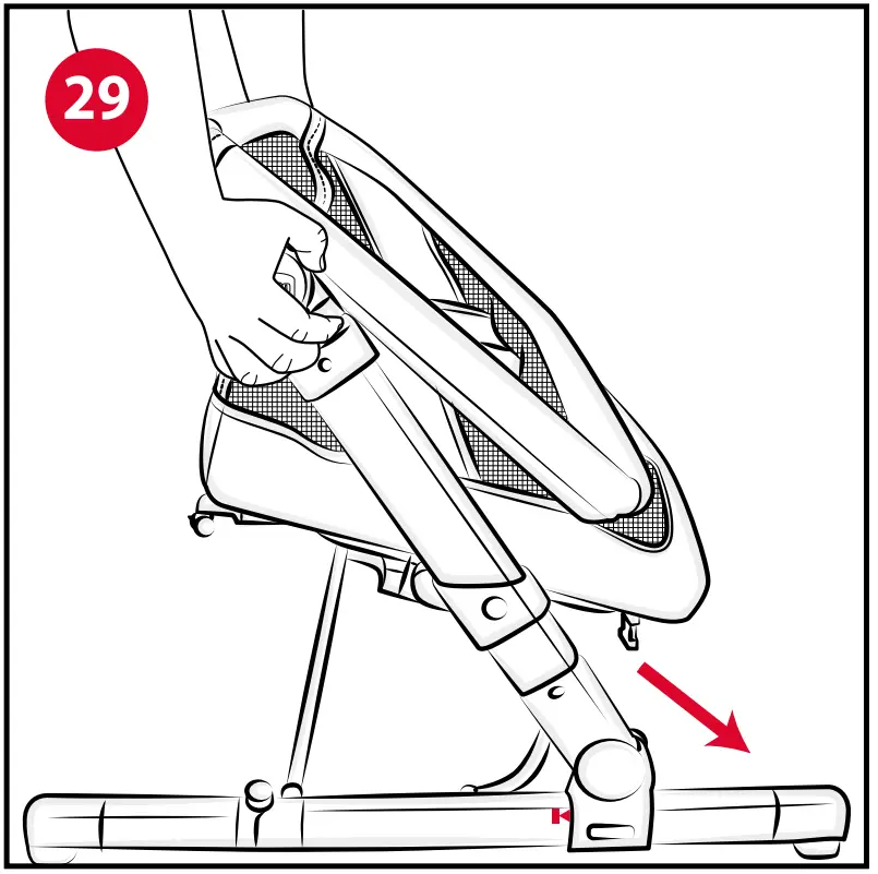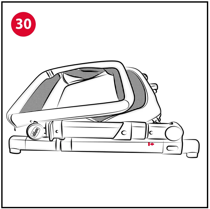 - Fold the frame by having it run downwards while continuing to push frontwards (Fig. 29-30). The release buttons described above must be pressed and held down until the crib is completely folded.