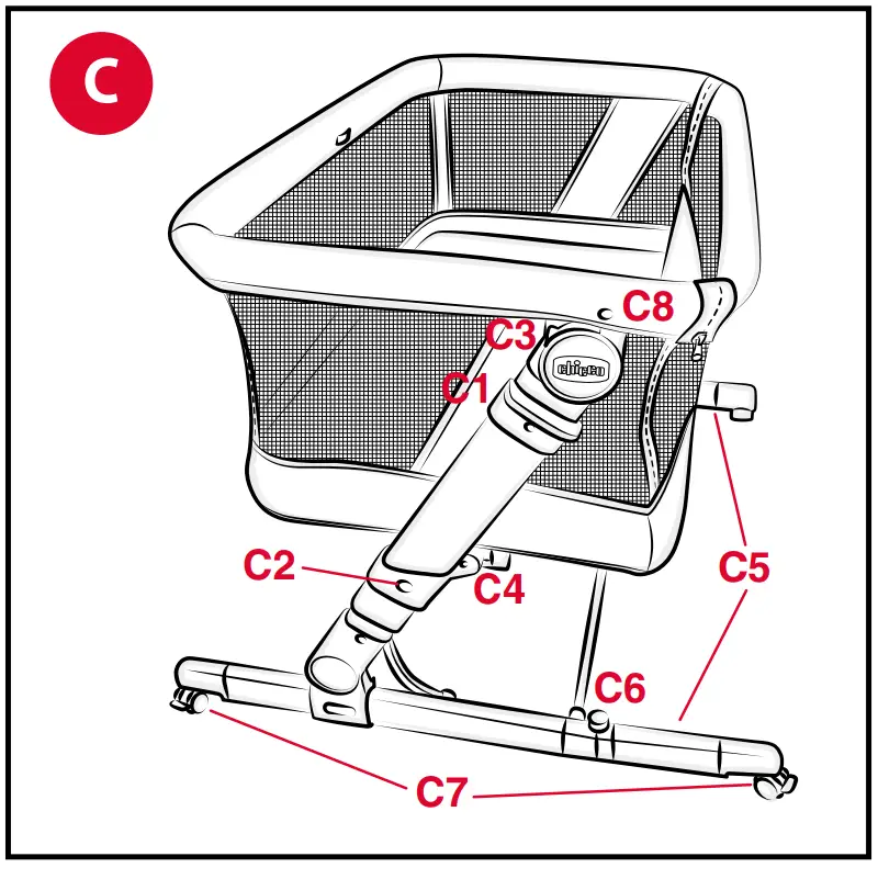 WARNING: Before each use, make sure that there is no space between the parents’ mattress and side of the crib. Otherwise adjust the straps by pulling firmly until the required condition is restored. - Lock the crib’s wheels. If, when fastening the crib to the parents’ bed, the feet of the crib do not fit under the parents’ bed, the crib can be fastened to the bed anyway by following the instructions above with the added step of rotating the articulated feet “C5” when pressing the crib up against the bed.