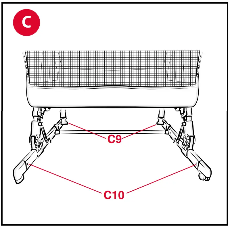 The crib can be partially disassembled, removing the rear feet by pressing on the release button “C10” and pulling the feet outwards (Fig. 38-39).