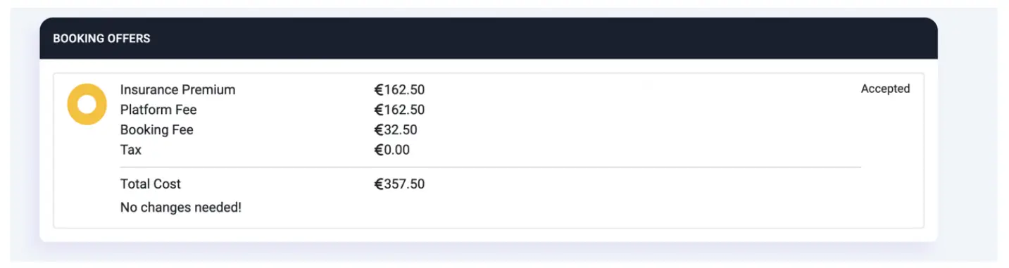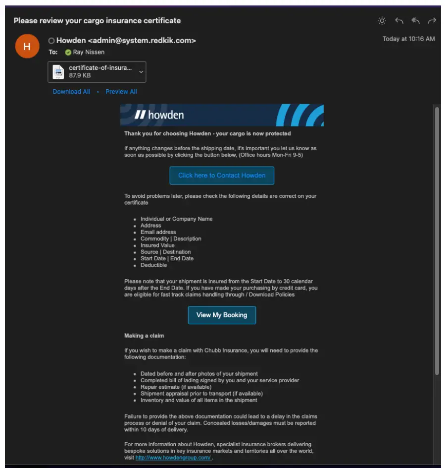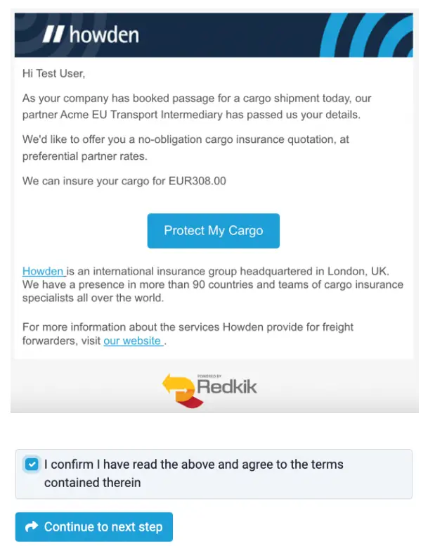 The status of the booking is set to “Pending” until confirmed by the customer. The owner of the shipment will receive a quotation email from Howden <[email protected]> which informs them who the insurance provider is and the total cost of insurance for this shipment.
