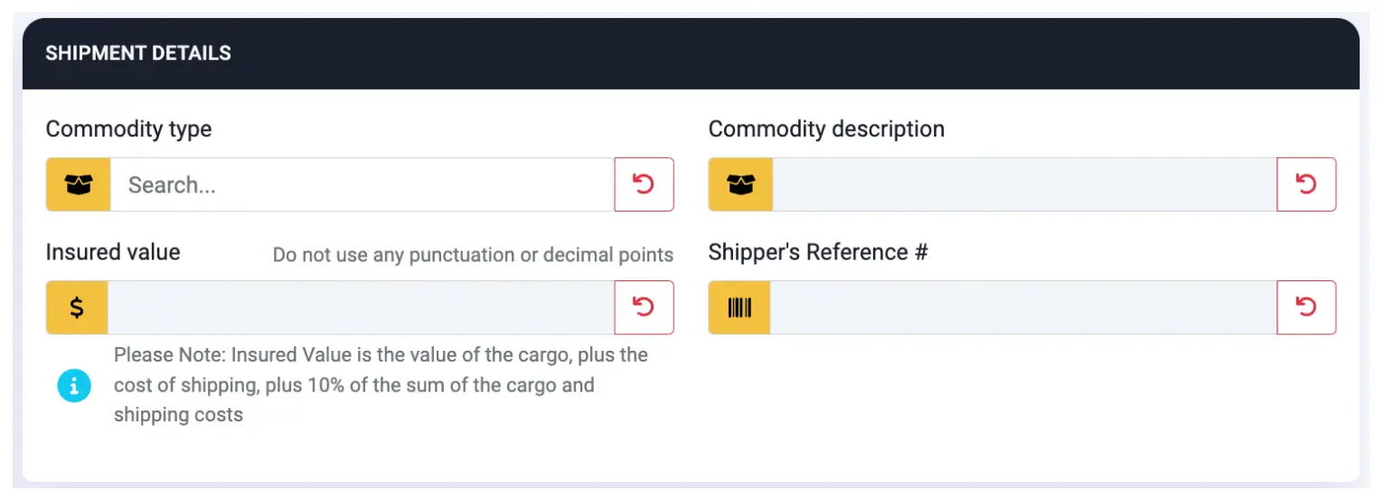 - Commodity description – This is a free form field, but you should be as accurate as possible in your description of the cargo. This information will be important should you need to file a claim. Not a required field.