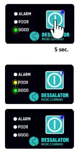 for about 5 seconds until the YELLOW and GREEN LEDs are both lit and a long ‘beep’ is heard from the buzzer. - Upon release of the button, the watermaker will STOP and initiatean automatic rinse cycle before going to STANDBY.