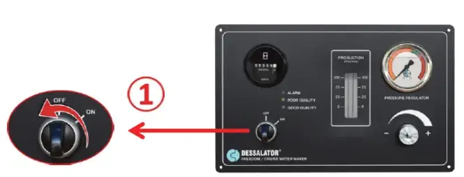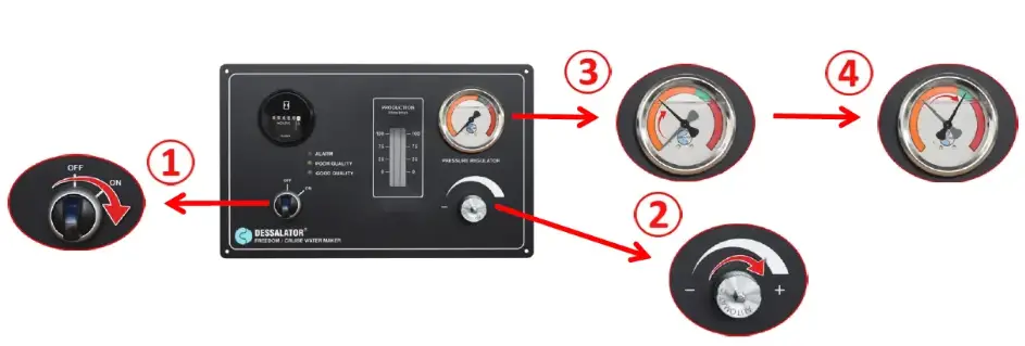 Simply set switch 1 to ON the pressure regulator dial 2 will automatically go in the green zone of the pressure gauge as shown in 3 then 4. This procedure takes about 3 minutes. Once this procedure is done, your watermaker will start producing fresh water, after checking that it is of good quality.