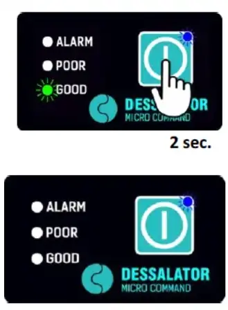 - To STOP your watermaker normally: Press and hold the button for about 2 seconds. Upon release of the button, the watermaker will STOP and go to STANDBY.