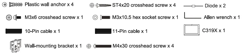 Twist M3xl0.5 hex socket screw into the bottom hole of the wall-mounting bracket until the tail of which align to the edge. Then fix the wall-mounting bracket on the wall with two M4x30 crosshead screws. If there is a ground wire to be connected, use M3x6 crosshead screw to fix it on the
