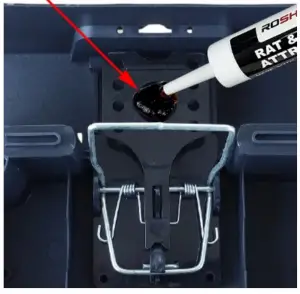Insert the trap into the box with the trigger mechanism facing the fixing holes. The box has a fitting plate to which the Roshield traps fit snugly into. | Bait the trap with an appropriate attractant within the central bait cup. | Place a thumb on the top metal bar and push down, keeping fingers clear of the active area Push the bar all the way to the base until the bar clicks into place. The trap is now set. |