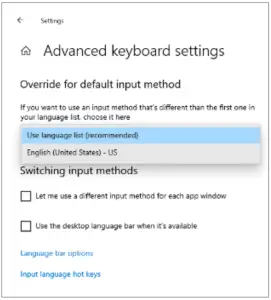 - Verify if the correct keyboard layout is selected in Windows Settings, and if the layout matches with your keyboard. You can find this under “Advanced keyboard settings” under Settings in Windows shown to the right.