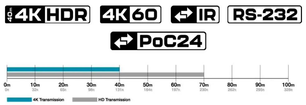 | Video Resolutions (Max) | 3840×2160 60fps HDR over 40m Cat5e/6/7 cable (1080P @ 70M) |