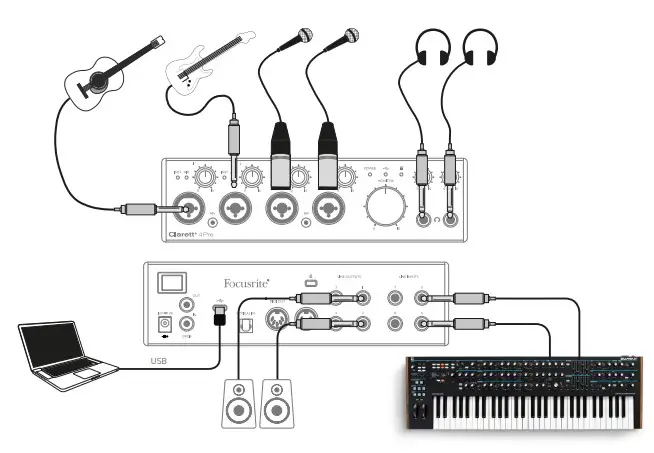 The Clarett+ 4Pre is an excellent choice for many recording and monitoring applications. Some typical configurations are shown below.