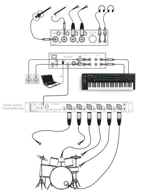 In addition to eight analogue inputs, the Clarett+ 4Pre has an ADAT input port (OPTICAL IN) which can provide an additional eight audio inputs at 44.1/48 kHz sample rate or four at 88.2/96 kHz. Using a separate 8-channel microphone preamplifier equipped with an ADAT output – such as the Clarett+ OctoPre – provides a method of expanding the Clarett+ 4Pre’s input capability. This could, for example extend the example above to include a close-miked drum kit, as shown below.