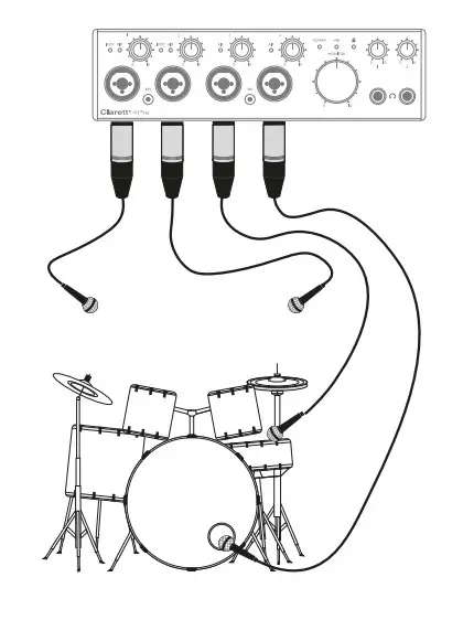 If an ADAT-equipped mic pre-amp is not available, a method of recording drums with just four mics and the Clarett+ 4Pre is shown below: