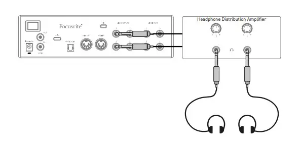 - (Headphones) – 1 and 2 – connect headphones here. The stereo mixes at these outputs are set up in Focusrite Control: Headphone 1 always carries the same mix as Line Outputs 3 and