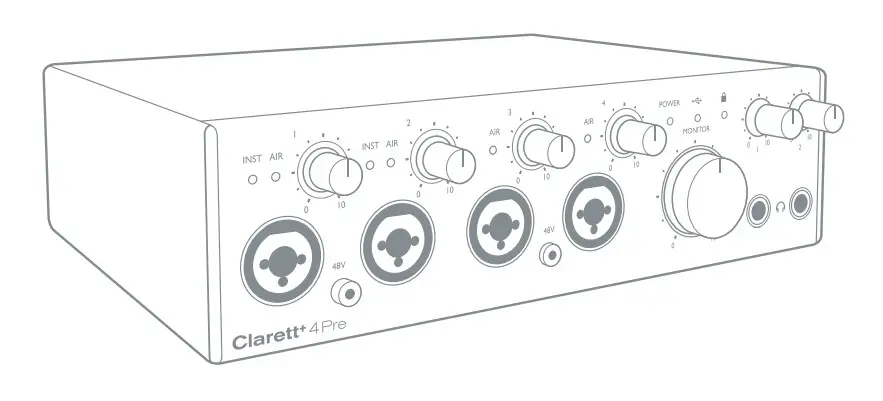 Thank you for purchasing this Clarett+ 4Pre, the studio-grade audio interface for PC and Mac, designed for music makers who demand the highest quality while recording and mixing their audio creations. The All-analogue Air function will capture your vocals, drums and acoustic instruments with immense clarity and two JFET instrument inputs will let you plug straight in and preserve your natural tone.