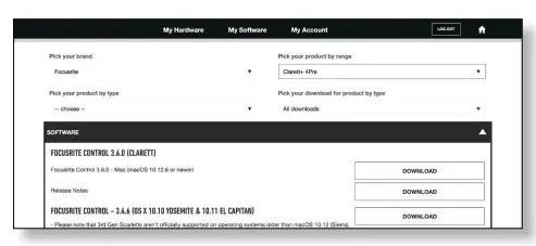 Focusrite Control is available at focusrite.com/downloads. On Windows, Focusrite Control will also install the driver required. Mac users: Clarett+ 4Pre is class-compliant on Macs, therefore no drivers are required. As a Clarett+ owner, you are also entitled to a selection of third-party software.