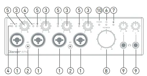 - (Locked) – a green LED which confirms clock synchronisation, either to the Clarett+ 4Pre’s internal clock or to an external digital input.