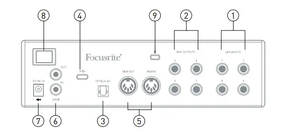 - LINE OUTPUTS 1 to 4 – four balanced analogue line outputs on ¼” jack sockets; use TRS jacks for a balanced connection or TS jacks for unbalanced. Line Outputs 1 and 2 will generally be used for driving main L and R speakers of your monitoring system, while Outputs 3 and 4 can be used for connecting additional line level equipment (e.g., outboard FX processors). Signals routed to all the outputs may be defined in Focusrite Control.