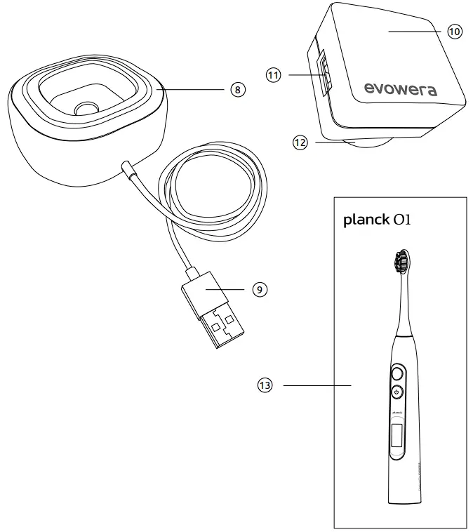 Congratulations on purchasing your new evowera planck O1 adaptive control sonic electric toothbrush (hereinafter referred to as ‘product’). Read this entire document carefully to ensure proper configuration before use and it is recommended to keep this document for future reference. This product is a personal care device. By using this product, you hereby agree to this disclaimer and signify that you have read it fully. Please use this product in strict accordance with the document, user manual, related regulations, terms of use and be sure to pay attention to the Important.