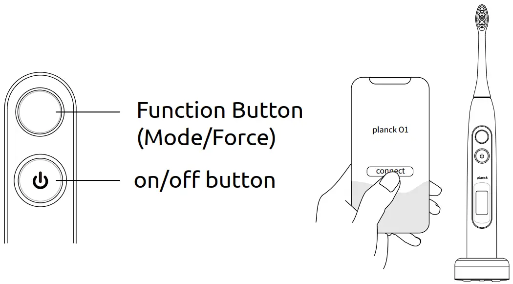 - Press and hold function button to confirm mode and exit to home page. Press on/off button once to start teeth brushing.