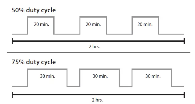 If you have a set point of 20″°C, the thermostat will use the full power until the temperature is 19″°C. The thermostat will then begin to regulate the output from 19″°C with a 75% duty cycle until it reaches 19,25″°C. When the temperature has reached 19.5″°C the thermostat will use a 50% duty cycle, until it reaches 20″°C, then the thermostat turns off and repeats the process. For example, at a 75% duty cycle it will turn ON for a total of 90 minutes and OFF for 30 minutes.