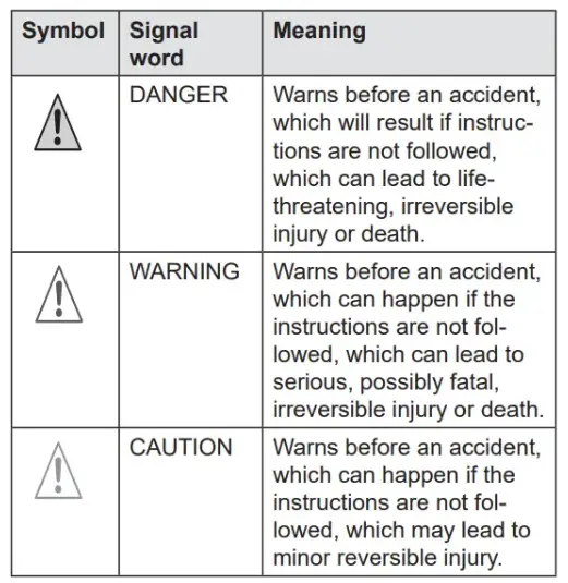 - The following table describes the icons used in these oper-ating instructions that are used for imaging of the danger-ous situation in connection with the symbol of the threat level.