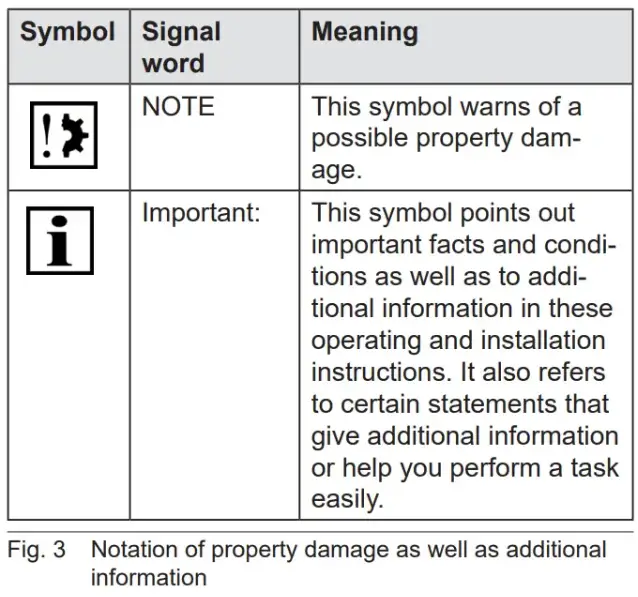 - The following table defines the representation used in the operating instructions and description of situations where damage can occur to the product or refers to important facts, conditions, tips and information.
