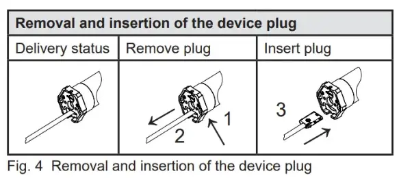 - For devices with protection class IP44, the ends of all cables or connectors must be protected against the ingress of moisture. This measure must be implemented immediately after removal of the RolTop/D+ M from the original packaging.