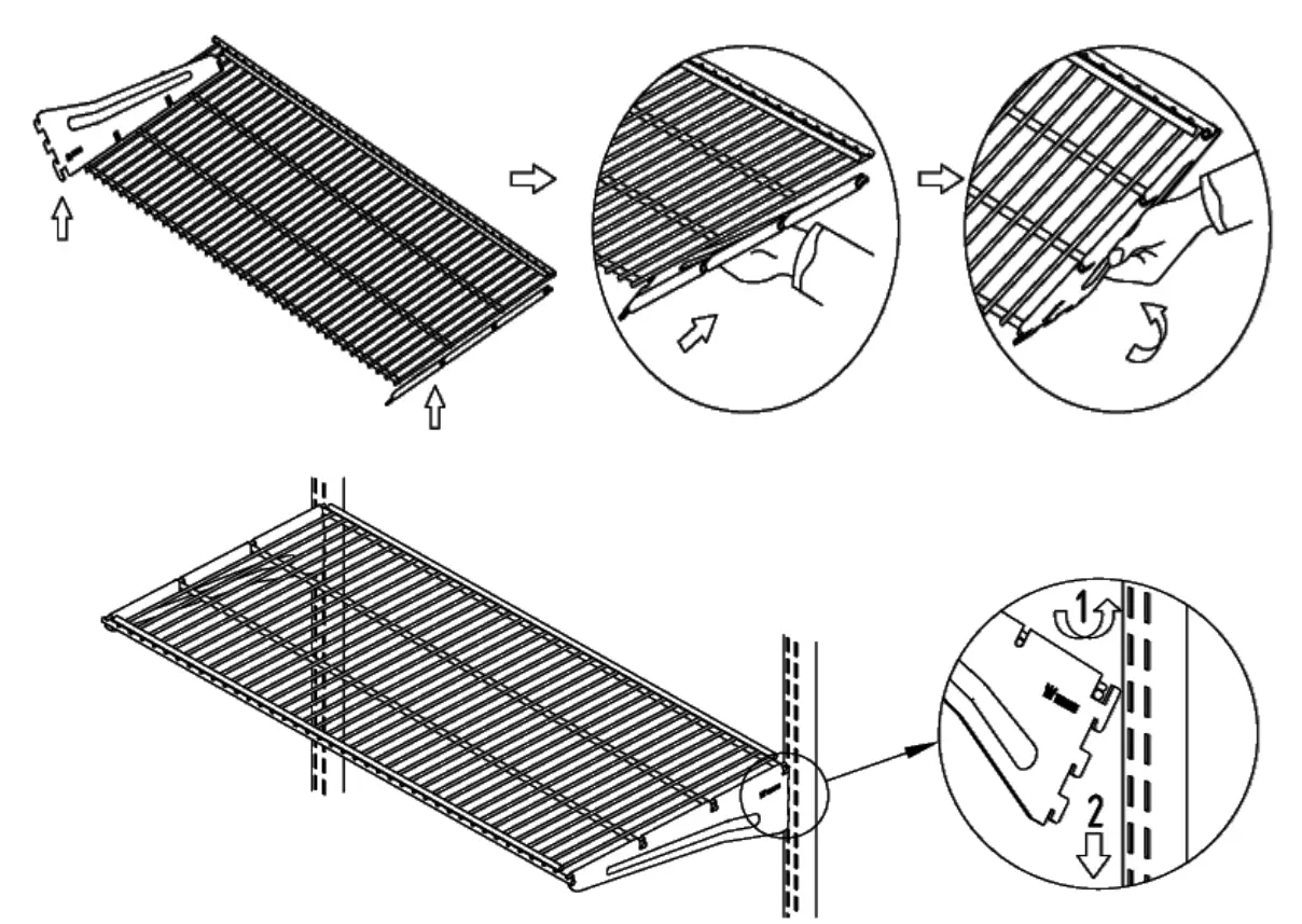 (See image below) make sure that brackets attach over the top of the wire shelf with flat surface up. Attach left and right lock-on hanging brackets over each side. Wire shelf should be installed level and in the inside slot positions of each hang rail spaced 30-3/8” apart. If accidental binding occurs use soft rubber mallet to help remove accessory and protect paint. To attach and detach push unit upward into the rail slots and push in or pull out at about a 45 degree angle.