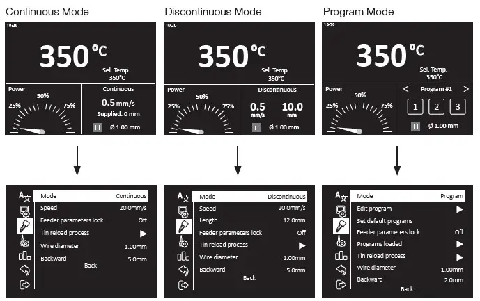 The solder wire dispensing values can directly set up from the work screen. Press or to change the tool temperature value.